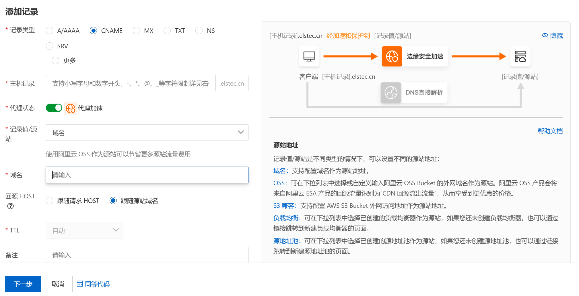 前期需要有一个域名DDNS到IPV6的地址。然后直接在DNS添加一条CNAME记录。源站选域名以及跟随源站域名即可。下一步后会选择是静态资源加速还是音视频还是其他加速,根据需求选择。NAS主页静态资源,emby这类就选择音视频,非常简单。